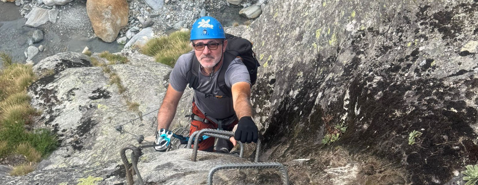 Per Simone di Perugia prima volta in vacanza in Valle Ossola. Simone in cerca di una ferrata di media difficoltà alla sua seconda esperienza su questo tipo di terreno. L'anno scorso aveva salito la sua prima ferrata in dolomiti. Un'esperienza diversa fatta su un terreno diverso dal nostro granito, dove a volte gli appoggi per i piedi dove nn ci sono le staffe della ferrata , sono "spalmate " sulla placca. Dopo un breve adattamento eccolo muoversi con disinvoltura e in un paio di orette terminiamo la salita. Mi ringrazia e mi dice di essere molto felice, sia per aver realizzato questa esperienza e per l'ambiente stupendo del Sempione e della zona. Ci accingiamo alla discesa a piedi prima per una stradina asfaltata e poi per un bellissimo sentiero che passa attraverso un bosco di larici e termina passando accanto a un laghetto artificiale di allevamento di trote. finiamo la giornata davanti a una meritata birra. Bravo Simone