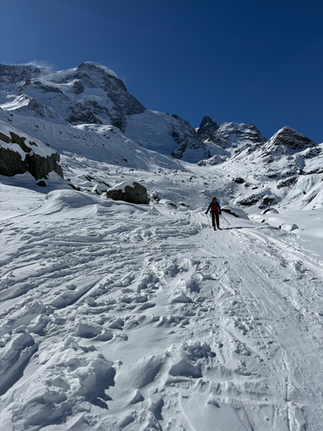 Giornate Magnifica anche se iniziata un pò roccambolesca. Gli impianti di Cervinia a causa di un guasto tecnico ci hanno tenuti fermi a Plain Maison fino alle 9/30. Finalmente poi risolto ilmproblema ci hanno fatto salire e siamo arrivati aPlateau Rosà Da qui calzati gli sci siamo scesi in direzione di Zermatt e girando a dx ci siamo immessi nel fuoripista che sxcende a Zermatt incanalandoci nell'Unter teodulo gletscher. Paesaggio superbo immerso in un ambiente glaciale da favola. temperature molto fredde . -11 gradi alla partenza. Neve molto veloce a causa delle temperature. Polverosa tratti crostoisa nella parte centrale della discesa. Una volta giunti a Furi , Abbiamo ripreso gli impianti salendo fino al piccolo Cervino . qui una piccola discesa e poi cambio di assetto e calzato le pèellidi foca, ci siamo diretti verso lla porta Nera. Il passaggio si trocìva aìtra il polluce e la roccia nera. In circa 40/45 minuti ndin cammino si arriva agevolmente al colle , ci si ricambia di assetto e ci si infila nel ghiacciaio sempre molto movimentato, fino alla confluenza con il ghiacciaio del Gorner. Abbìiamo trovato condizioni top con neve polverosa e siamo risuciti a prendere nonostante tutto la cabinovia a Furi alle 14.40. Nota importante bisogna ricordarsi che alle 15,30 è l'ultima risalita per ritornare in Italia. da qui ancora una bellissima sciata sulle piste per il rientro a Cervinia. Giornata indimenticabile grazie a Damiano per l'ottima compagnia.