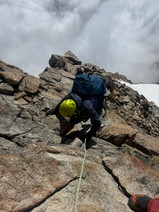 Ieri siamo saliti su questa splendida cresta, con un panorama surreale per il mare di nuvole sottostante. Infatti per quasi tutta la giornata da quota 3500 circa sono stati presenti banchi nuvolosi a bassa quota ed è stato entusiasmante arrampicare sopra il mare di nuvole. Non bisogna sottovalutare quota a cui ci si trova. La roccia è a tratti scivolosa e non sempre stabile.