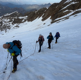 Ultimo giorno con questo aplemdido quartetto oramai affiatatissimo. Stamattina abbiamo deciso di fare con calma … ma non troppo perché le previsioni meteo , sempre e sempre quelle alle 10/30 danno un passaggio di temporali e acqua . Cosa che poi in effetti come da radar svizzero si è avverato! Bene quindi sveglia alle 5 e alle 6 scendiamo dal rifugio Mantova per andare verso Indren. Prendiamo una traccia alta e guadagnamo quota di un centinaio di Mt di dislivello iniziando a salire oggi la salita e’ ripida anche a causa delle tracce lasciate dalle molte persone che il giorno prima hanno salito e sceso questa cima e il rigelo notturno ha lasciato solchi e gradini profondi nella neve faticando più del dovuto nonostante i zig zag per evitare la salita sulla traccia diretta. Bravi tutti e vetta conquistata e scusaci Walter se dalla Cina ti abbiamo chiamato svegliandoti dalla pennichella sul ghiacciaio … ma dovevamo svegliarti 😜😜